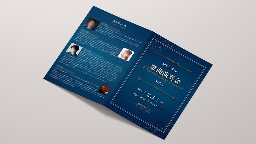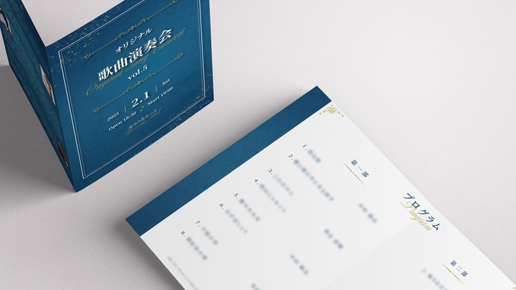 元々ご用意いただいていた演奏会チラシの雰囲気に合わせて、和のテイストを取り入れつつ、スタイリッシュに仕上げました。